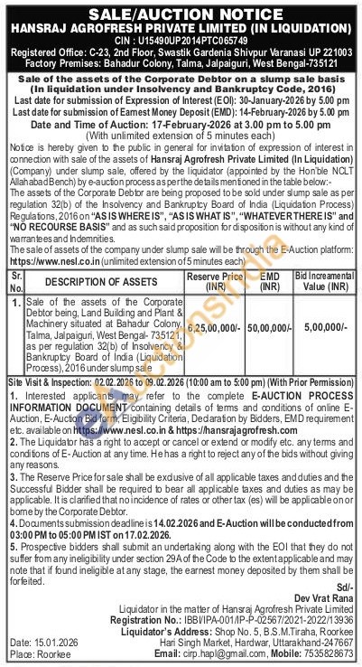 Sale of the assets of the Corporate Debtor being, Land Building and Plant & Machinery situated at Bahadur Colony, Talma, Jalpaiguri, West Bengal-735121, as per regulation 32(b) of Insolvency & Bankruptcy Board of India (Liquidation Process), 2016 under slump sale