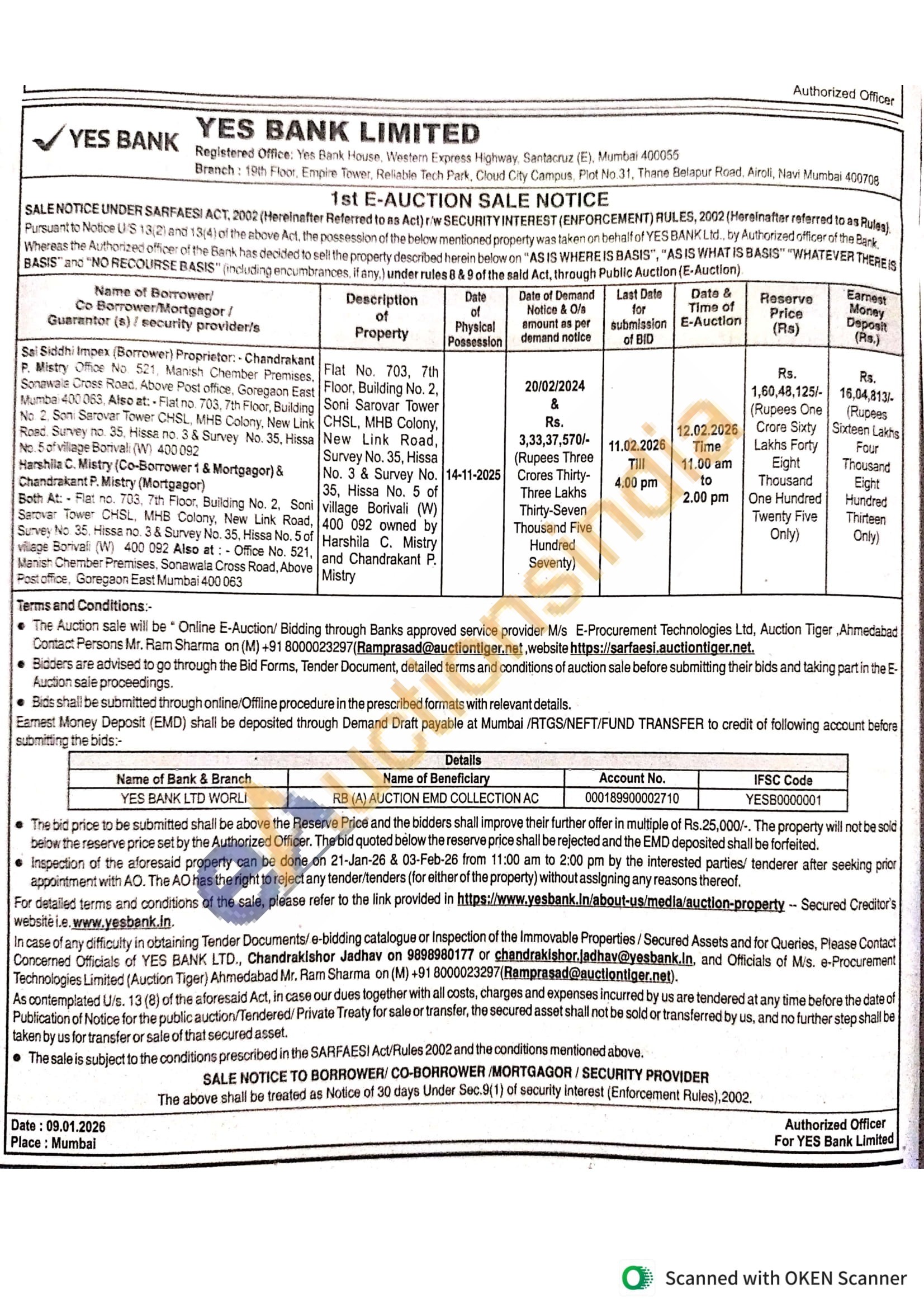 Flat No. 703, 7th Soni Sarovar Tower CHSL, MHB Colony, Floor, Building No. 2, New Link Road, Survey No. 35, Hissa No. 3 & Survey No. 35, Hissa No. 5 of village Borivali (W) 400 092 owned by Harshila C. Mistry and Chandrakant P. Mistry