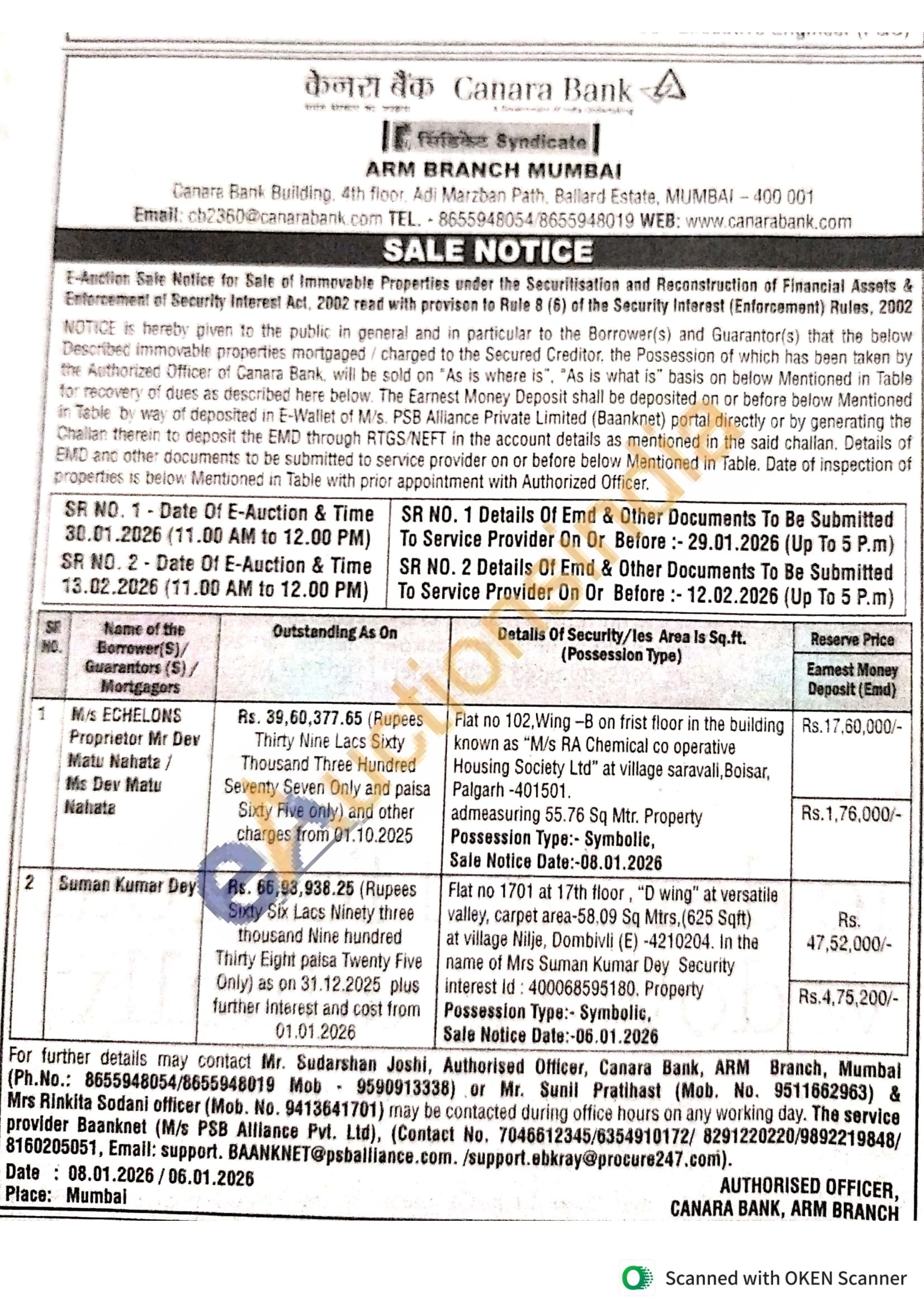 Contact Mr. Sudarshan Joshi, Authorised Officer, Canara Bank, ARM Branch, Mumbal (Ph.No.: 8655948054/8655948019 Mob 9590913338) or Mr. Sunil Pratihast (Mob. No. 9511662963) & Mrs Rinkita Sodani officer (Mob. No. 9413641701)