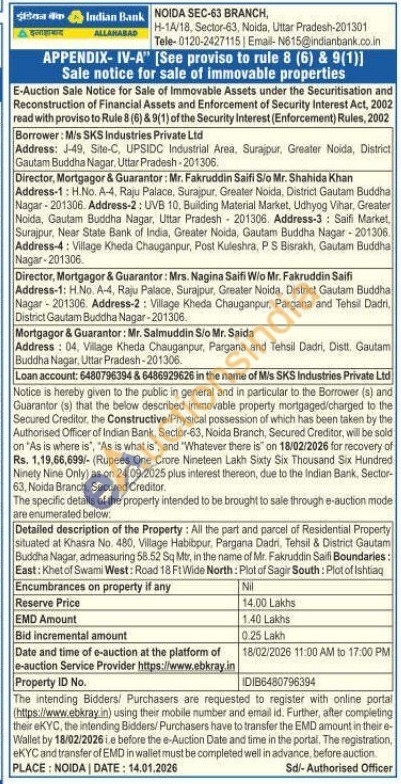 Detailed description of the Property: All the part and parcel of Residential Property situated at Khasra No. 480, Village Habibpur, Pargana Dadri, Tehsil & District Gautam Buddha Nagar, admeasuring 58.52 Sq Mtr, in the name of Mr. Fakruddin Saifi Boundaries: East: Khet of Swami West: Road 18 Ft Wide North: Plot of Sagir South: Plot of Ishtiaq