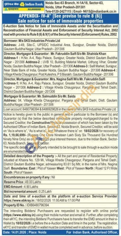 Detailed description of the Property :- All the part and parcel of Residential Property situated at Khasra No. 129 Mi, Village Kheda Chauganpur, Pargana and Tehsil Dadri, District Gautam Buddha Nagar, admeasuring 83.61 Sq Mtr, in the name of Mrs. Nagina Saifi. Boundaries: East: Plot of Yaseen West: Plot of Yaseen North: Road 12 Ft Wide South: Plot of Yaseen