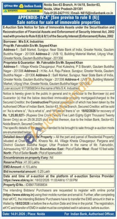 Detailed description of the Property: All the part and parcel of Residential Property situated at Chak No. 114, Khasra No. 44, Village Kheda Chauganpur, Pargana and District Gautam Buddha Nagar, Uttar Pradesh in the name of Mr. Fakruddin, Admeasuring 167.20 Sq Mtr. Boundaries: East: Piot of Seller West: Road 10 feet wide North: Plot of Seller South: Plot of Iqramuddin
