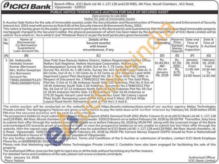 Sree Potti Sree Ramulu Nellore District, Nellore Registration District Office Nellore Sub Registrar. Nellore Municipal Corporation, Nellore City, Kondayapalem Survey No: 419/A Out of Ac 1-75 Cents, Ac 0-88 Cents, Survey No: 421/A Ac 1-68 Cents, Survey No: 422 Ac 0.98 Cents Total Ac 3-64 Cents. Out of Ac 1-33 Cents Ac: 0-32 Cents or 192 Ankanas Land With Approved Layout Plan Municipal Ward No: 26-1. Near Door No: 1990, In Respect of Document No: 17845/2022 We Have Rights In The Said Plots Plot No: 3 Out of 21.56 Ankonas South Side 220 Ankanas, Plot No: 6 Out of 18.45 Ankanas South Side 2.20 Ankonas, Document No. 17846/2022 Plot No. 04 Out of 22.13 Ankarnas North Side 16.1476 Ankanas Plot No: 05 Out of 18.94 Ankonas Norths Side 13.82 Ankanas Total 34.40 Ankanas or 275.20 Sqyds Vacant Land And Its Boundaries: East: Sbi Colony Layout Plots South: Remaining Land of Plot No's 4 And 5 West: 20 Feet Wide Layout Road North: Remaining Land of Plot No's 3 And 6.