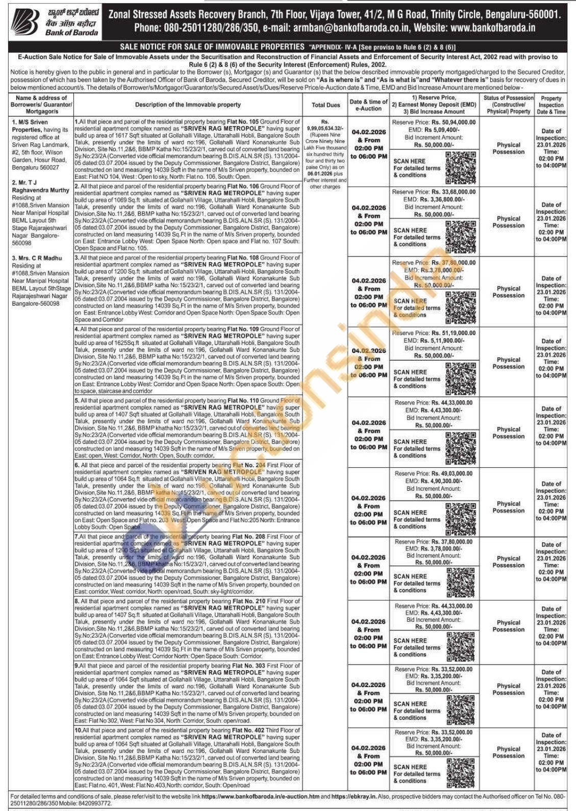 10. All that piece and parcel of the residential property bearing Flat No. 402 Third Floor of residential apartment complex named as "SRIVEN RAG METROPOLE" having super build up area of 1064 Sqft situated at Gollahalli Village, Uttarahalli Hobli, Bangalore South Taluk, presently under the limits of ward no. 196, Gollahalli Ward Konanakunte Sub Division, Site No. 11,286,8BMP Katha No:15/23/2/1, carved out of converted land bearing Sy.No:23/2A (Converted vide official memorandum bearing B.DIS.ALN.SR (S), 131/2004-05 dated 03.07.2004 issued by the Deputy Commissioner, Bangalore District, Bangalore) constructed on land measuring 14039 Sqft in the name of Mis Sriven property, bounded on East: Flat no. 401, West: Flat No.403, North: corridor, South. Open/road