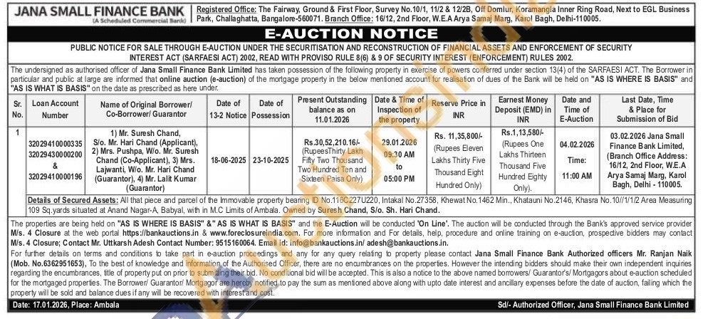 All that piece and parcel of the Immovable property bearing ID No.116C227U220, Intakal No.27358, Khewat No. 1462 Min., Khatauni No.2146, Khasra No. 10//1/1/2 Area Measuring 109 Sq.yards situated at Anand Nagar-A, Babyal, with in M.C Limits of Ambala. Owned by Suresh Chand, S/o. Sh. Hari Chand.
