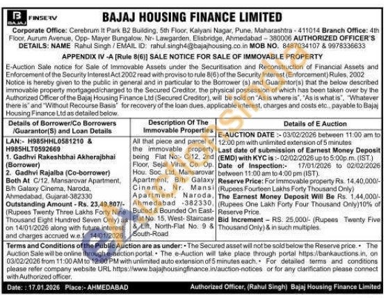 All that piece and parcel of the immovable property being Flat No:- C/12, 2nd Floor, Sejal Vihar Co. Op. Hou. Soc. Ltd, Mansarovar Apartment, B/h Galaxy Cinema, Nr. Mansi Apartment, Naroda, Ahmedabad -382330 Butted & Bounded On East-Flat No. 15, West-Staircase & Lift, North-Flat No. 9 & South-Road