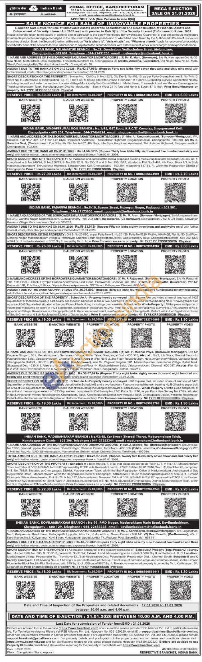 2) All that piece and parcel of the land & proposed building measuring to a total extent of UDS 460 Sq. ft. comprised in S. No.249/2A, S. No.250/13, S. No.250/12, S. No.250/11 and S. No. 250/10A1, situated at Flat No.A-407, 4th Floor, Block A Life Style Happinest Apartment" Thirukatchur Highroad, Singaperumal Koil, Chengalpattu-603 204, measuring 847 Sq. ft, within the Registration District of Chengalpattu. Prior Encumbrances on property: Nil. TYPE OF POSSESSION: Physical