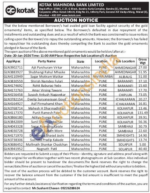 Kotak Mahindra Bank Gold Auctions Auction in Pune