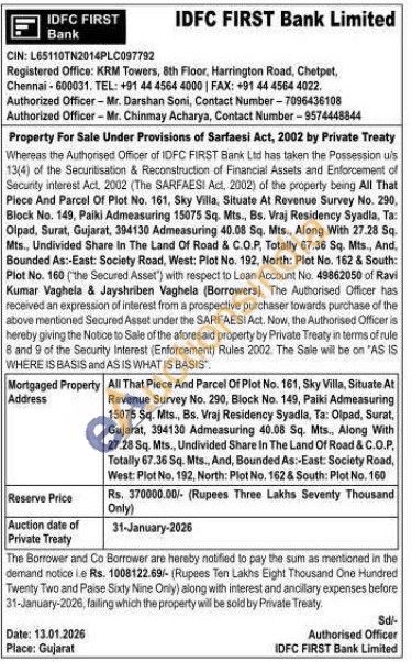 All That Piece And Parcel Of Plot No. 161, Sky Villa, Situate At Revenue Survey No. 290, Block No. 149, Paiki Admeasuring 15075 Sq. Mts., Bs. Vraj Residency Syadla, Ta: Olpad, Surat, Gujarat, 394130 Admeasuring 40.08 Sq. Mts., Along With 27.28 Sq. Mts., Undivided Share In The Land Of Road & C.O.P. Totally 67.36 Sq. Mts., And, Bounded As:-East: Society Road, West: Plot No. 192, North: Plot No. 162 & South: Plot No. 160