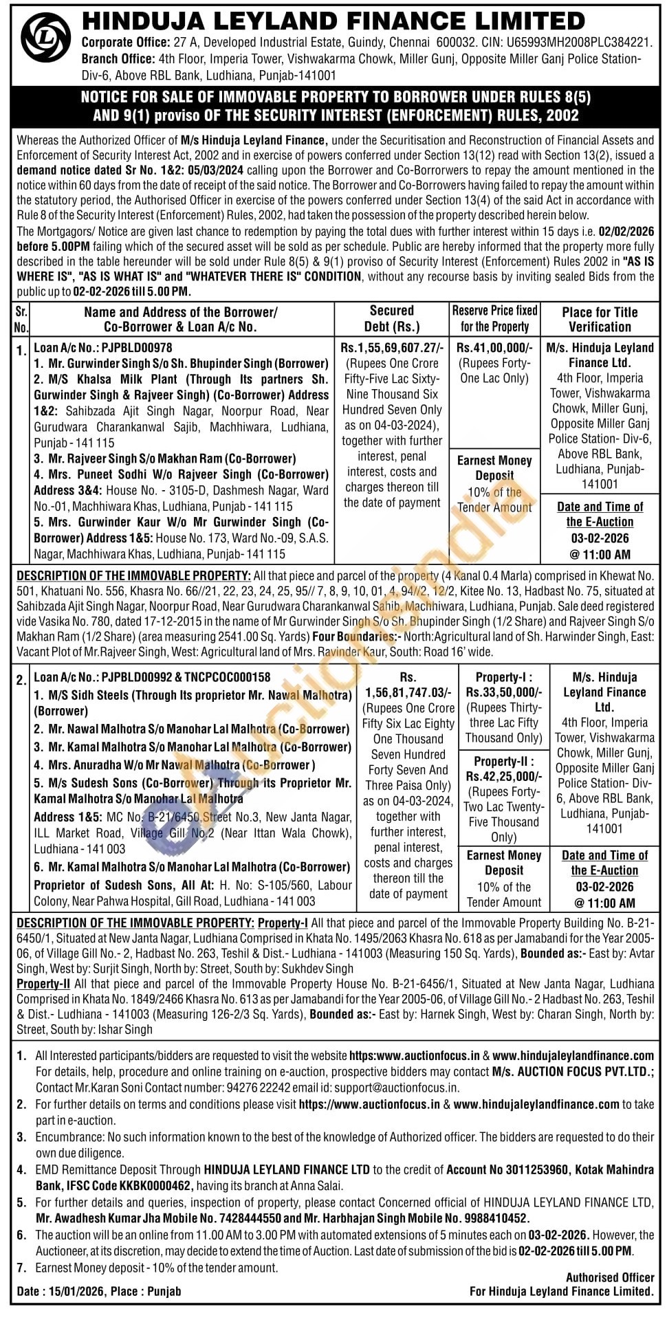 PROPERTY: All that piece and parcel of the property (4 Kanal 0.4 Marla) comprised in Khewat No. 501, Knatuani No. 556, Khasra No. 66//21, 22, 23, 24, 25, 95//7, 8, 9. 10, 01, 4, 94//2, 12/2, Kitee No. 13, Hadbast No. 75, situated at Sahibzada Ajit Singh Nagar, Noorpur Road, Near Gurudwara Charankanwal Sahib, Machhiwara, Ludhiana, Punjab. Sale deed registered vide Vasika No. 780, dated 17-12-2015 in the name of Mr Gurwinder Singh Sto Sh. Bhupinder Singh (1/2 Share) and Rajveer Singh Sio Makhan Ram (1/2 Share) (area measuring 2541.00 Sq. Yards) Four Boundaries:-North: Agricultural land of Sh. Harwinder Singh, Fast Vacant Piot of Mr. Rajveer Singh, West: Agricultural land of Mrs. Ravinder Kaur, South: Road 16' wide.