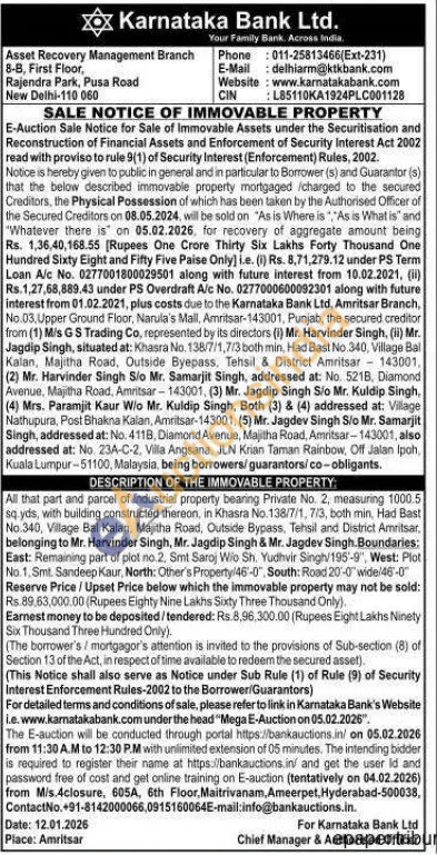 All that part and parcel of industrial property bearing Private No. 2, measuring 1000.5 sq yds, with building constructed thereon, in Khasra No. 138/7/1, 7/3, both min. Had Bast No.340, Village Bal Kalan, Majitha Road, Outside Bypass, Tehsil and District Amritsar, belonging to Mr. Harvinder Singh, Mr. Jagdip Singh & Mr. Jagdev Singh Boundaries: East: Remaining part of plot no. 2, Smt Saroj Wio Sh. Yudhvir Singh/195-9", West: Plot No. 1. Smt. Sandeep Kaur, North: Other's Property/46-0", South: Road 20-0" wide/46-0