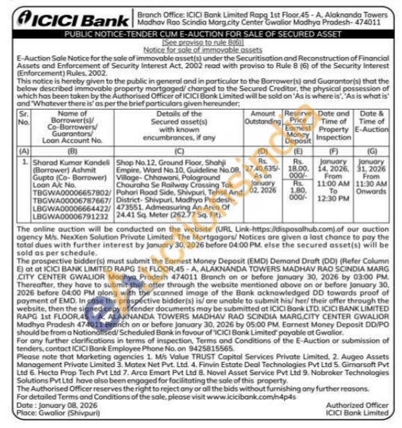 Shop No.12, Ground Floor, Shahji Empire, Ward No.10, Guideline No.08. Village-Chhawani, Pologround Chouraha Se Railway Crossing Tak Pohori Road Side, Shivpuri, Tehsil And District-Shivpuri, Madhya Pradesh-473551. Admeasuring An Area Of 24.41 Sq. Meter (262.77 Sq. Fit)