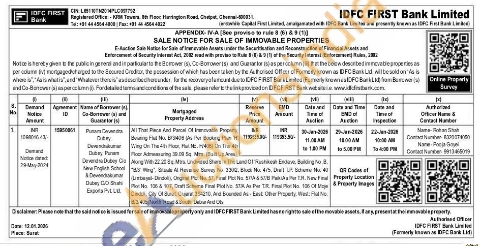 All That Piece And Parcel Of Immovable Property, Bearing Flat No. B/3/406 (As Per Booking Plan 'H' Wing On The 4th Floor, Flat No. H/406) On The 4th Floor Admeasuring 39.09 Sq. Mtrs. (Built Up Area),Along With 22.20 Sq. Mtrs. Undivided Share In The Land Of "Rushikesh Endave, Building No. B, "B/3" Wing", Situate At Revenue Survey No. 330/2, Block No. 475, Draft T.P. Scheme No. 40 (Limbayat-Dindoli), Original Plot No. 57, Final Plot No. 57/A & 57/B PaikiAs Per T.R. New Final Plot No. 106 & 107, Draft Scheme Final Plot No. 57/A As Per T.R. Final Plot No. 106 Of Moje Dindoli, City Of Surat, Gujarat 394210, And Bounded As:- East: Other Property, West: Flat No. B/3/405, North: Road & South: Dabar And Ots