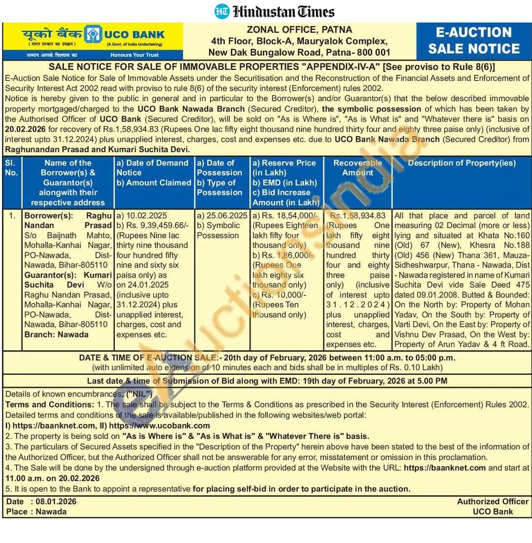 All that place and parcel of land measuring 02 Decimal (more or less) lying and situated at Khata No.160 (Old) 67 (New), Khesra No.188 (Old) 456 (New) Thana 361, Mauza-Sidheshwarpur, Thana - Nawada, Dist Nawada registered in name of Kumari Suchita Devi vide Sale Deed 475 dated 09.01.2008. Butted & Bounded: On the North by: Property of Mohan Yadav, On the South by: Property of , Varti Devi, On the East by: Property of Vishnu Dev Prasad, On the West by: Property of Arun Yadav & 4 ft Road