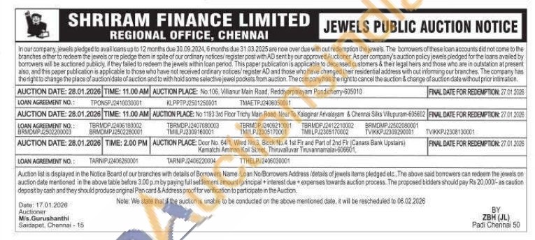 Shriram Finance Ltd Gold Auctions Auction in Chennai