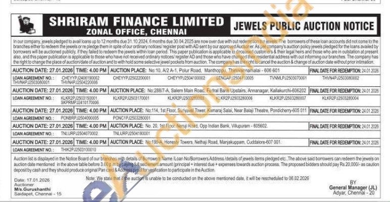 Shriram Finance Ltd Gold Auctions Auction in Chennai