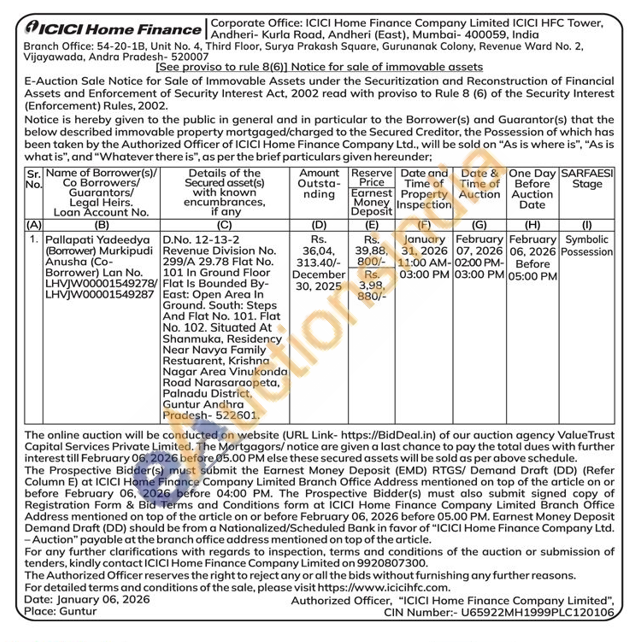 D.No. 12-13-2 Revenue Division No. 299/A 29.78 Flat No. 101 In Ground Floor Flat Is Bounded By-East: Open Area In Ground. South: Steps And Flat No. 101. Flat No. 102. Situated At Shanmuka, Residency Near Navya Family Restuarent, Krishna Nagar Area Vinukonda Road Narasaraopeta, Palnadu District, Guntur Andhra Pradesh-522601