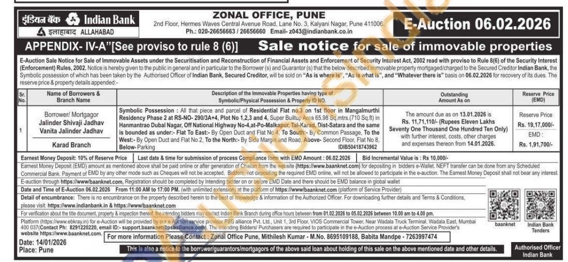 All that piece and parcel of Residential Flat no.3 on 1st floor in Mangalmurthi Residency Phase 2 at RS-NO-290/3A+4, Plot No 1,2,3 and 4, Super Builtup Area 65.98 Sq.mtrs.(710 Sq.ft) in Hanmantrao Dubal Nagar, Off National Highway No-4,at-Po-Malkapur, Tal-Karad, Dist-Satara and the same is bounded as under:- Flat To East:-By Open Duct and Flat No 4, To South:- By Common Passage. To the West:-By Open Duct and Flat No 2. To the North:- By Side Margin and Road, Above-Second Floor, Flat No 8. Below-Parking