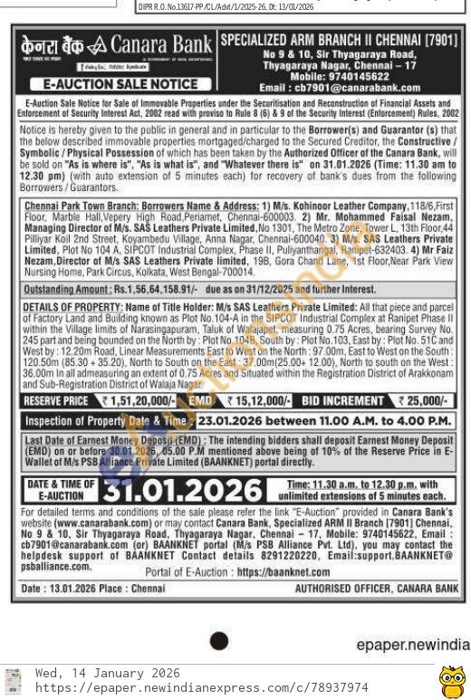 : Name of Title Holder: M/s SAS Leathers Private Limited: All that piece and parcel of Factory Land and Building known as Plot No. 104-A in the SIPCOT Industrial Complex at Ranipet Phase II within the Village limits of Narasingapuram, Taluk of Walajapet, measuring 0.75 Acres, bearing Survey No. 245 part and being bounded on the North by: Plot No.1048, South by: Plot No. 103, East by: Plot No. 51C and West by: 12.20m Road, Linear Measurements East to West on the North: 97.00m, East to West on the South: 120.50m (85.3035.20), North to South on the East: 37.00m (25.00+ 12.00), North to south on the West: 36.00m in all admeasuring an extent of 0.75 Acres and Situated within the Registration District of Arakkonam and Sub-Registration District of Walaja Nagar