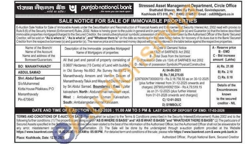 All that part and parcel of property consisting of 0.0607 Hectares (15 Cents) of Land with building in Old Survey No.69/2 Re Survey No.69/72 in Mananthavady Amsom and Vemom Desom of Mananthavady Taluk and Wayanad District owned by Sri Abdul Samad. Boundaries: East: Jafar Kaivasham. North: Abdurahiman kaivasam vayal. West: Ambalangadan Usman Kaivasham. South: Ambalangadan Ashraf Kaivasam,