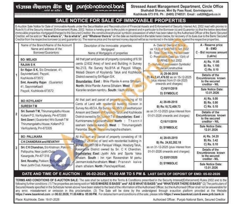 All that part and parcel of property consisting of 6.50 cents (2.632 Ares) of land and Building in Survey No.21/3, Re Survey No.8/1A at Payyoli Village, Meladi Desom of Koyilandy Taluk and Kozhikode District owned by Sri Rajan SK Boundaries: East: Ithile Planile A enna Sthalam. North: Ithile Planile Aenna Sthalam. West Mun Karanle randam nambru. South: Vazhi stalam.