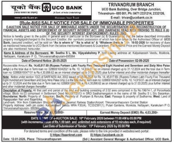 Landmark: 1km from Edakkulam Bhagvathy Temple: Nearest Railway Station/Airport: Thiruvananthapuram Central Station Property Address: (with pin code). Kalpakasseri Veedu MRA F30(A), TC33/2391(1), Pullari Gardens, Mukkola, Nettayam, Karakulam PO Thiruvananathapuram- 895564