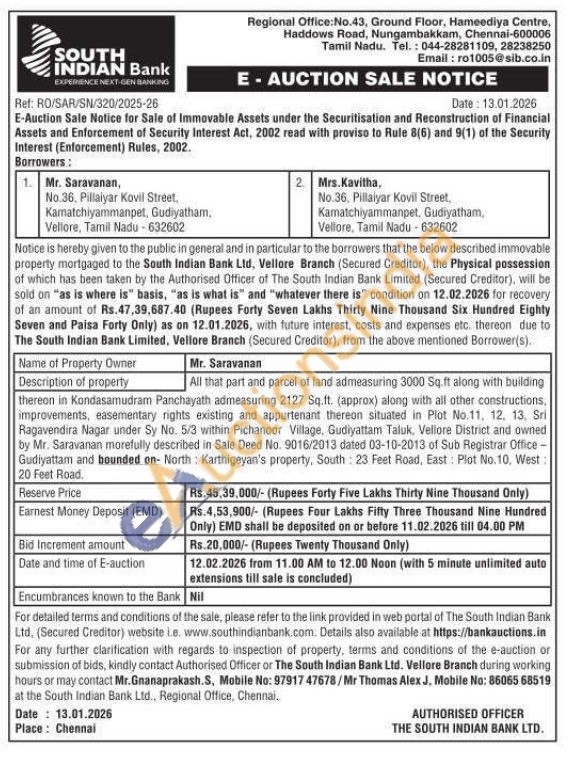 thereon in Kondasamudram Panchayath admeasuring 2127 Sq.ft. (approx) along with all other constructions, improvements, easementary rights existing and appurtenant thereon situated in Plot No.11, 12, 13, Sri Ragavendira Nagar under Sy No. 5/3 within Pichanoor Village, Gudiyattam Taluk. Vellore District and owned by Mr. Saravanan morefully described in Sale Deed No. 9016/2013 dated 03-10-2013 of Sub Registrar Office -Gudiyattam and bounded on- North Karthigeyan's property, South: 23 Feet Road, East: Plot No.10, West: 20 Feet Road.