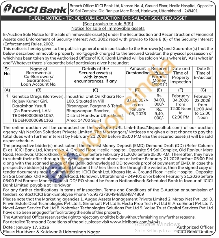 Industrial Unit On Khasra No.-100, Situated In Vill Birsangpur, Pargana & Tehsil Bhagwanpur, Roorkee, District Haridwar Uttrakhand.Area: 14700 Sq Ft