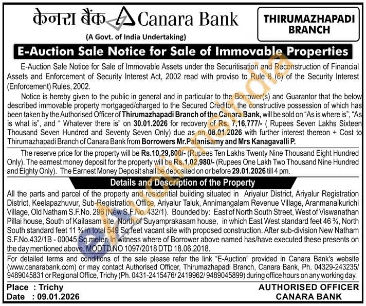All the parts and parcel of the property and residential building situated in Ariyalur District, Ariyalur Registration District, Keelapazhuvur, Sub-Registration Office, Ariyalur Taluk, Annimangalam Revenue Village, Aranmanaikurichi Village, Old Natham S.F.No. 296 (New S.F.No. 432/1). Bounded by: East of North South Street, West of Viswanathan Pillai house, South of Kailasam site, North of Suyamprakasam house, in which East West standard feet 46%, North South standard feet 11% in total 549 Sq.feet vacant site with proposed construction. After sub-division New Natham S.F.No.432/1B-00045 Sq.meter. In witness where of Borrower above named has/have executed these presents on the day mentioned above. MODTD NO 1097/2018 DTD 18.06.2018.