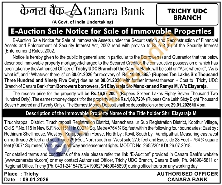 Tiruchirappali District, Tiruchirappali Registration District, Manachanallur Sub Registration District, Koothur Village, Old S.F.No. 115 in New S.F.No. 115/11 in 00071 Sq. Metre=764 1½ Sq.feet within the following four boundaries: East by: Rethinam Shell house, West by: Karuppannan House, North by: Kovil, South by: Vandipathai. Measuring east west on north side 26 feet and south side 29 Feet, North south on West side 27.6 feet and East side 28 Feet = 764 ½ square feet (00071Sq.meter) With usual pathway and easement rights. MODTD No. 2655/2018 Dt.26.07.2018.