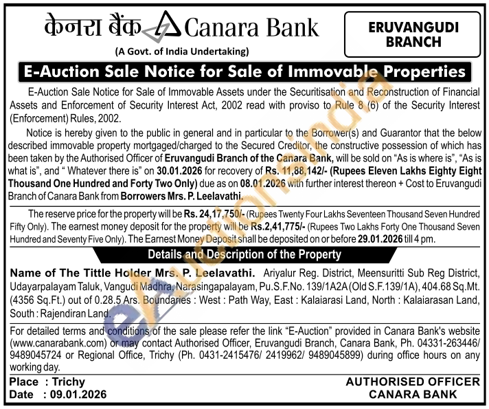 Name of The Tittle Holder Mrs. P. Leelavathi. Ariyalur Reg. District, Meensuritti Sub Reg District, Udayarpalayam Taluk, Vangudi Madhra, Narasingapalayam, Pu.S.F.No. 139/1A2A (Old S.F.139/1A), 404.68 Sq.Mt. (4356 Sq.Ft.) out of 0.28.5 Ars. Boundaries: West: Path Way, East: Kalaiarasi Land, North: Kalaiarasan Land, South: Rajendiran Land.