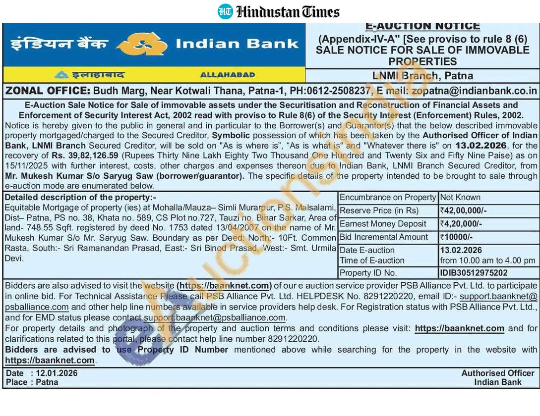 Equitable Mortgage of property (ies) at Mohalla/Mauza-Simli Murarpur, P.S. Malsalami, Dist-Patna, PS no. 38, Khata no. 589, CS Plot no.727, Tauzi no. Bihar Sarkar, Area of land-748.55 Sqft. registered by deed No. 1753 dated 13/04/2007 on the name of Mr. Mukesh Kumar S/o Mr. Saryug Saw. Boundary as per Deed: North:- 10Ft. Common Rasta, South:- Sri Ramanandan Prasad, East:- Sri Binod Prasad, West:- Smt. Urmila Devi.