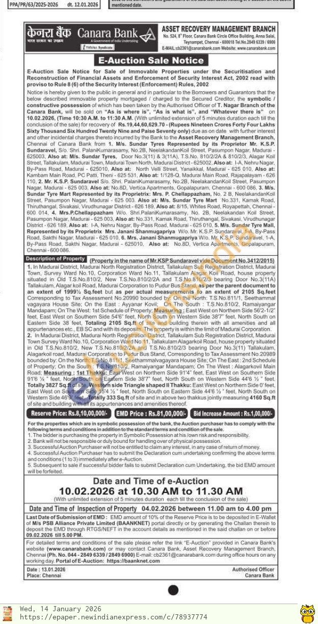 1. In Madurai District, Madurai North Registration District, Tallakulam Sub Registration District, Madurai Town, Survey Want No. 10. Corporation Ward No. 11, Tallakulam Alagar Koll Road, house property situated in Old TS No. 810/2, New T.S.No.810/2/2A and TS No.810/2/3 bearing Door No.3(11A) Tallakulam, Alagar koil Road, Madurai Corporation to Pudur Bus Stand, as per the parent document to an extent of 1999% Sq.feet but as per actual measurements to an extent of 2105 Sq.feet Corresponding to Tax Assessment No. 20990 bounded by On the North TS No.811/1, Seethammal vagayara House Site: On the East Ayyanar Kovil, On The South T.S.No.810/2, Ramaiyangar Mandapam, On The West: 1st Schedule of Property, Measuring: East West on Northern Side 562-12 feet, East West on Southern Side 548" feet, North South on Westem Side 38'7" feet. North South on Eastern Side 38 feet, Totaling 2105 Sq.ft of site and building therein with all amenities and all appurtenances etc., EB SC and with its deposits. The property is within the limit of Madurai Corporation 2. In Madurai District, Madurai North Registration District, Tallakulam Sub Registration District, Madurai Town Survey Ward No. 10, Corporation Ward No. 11, Tallakulam Alagarkoil Road, house property situated in Old T.S.No.810/2, New T.S No.810/2/2A and T.S.No.810/2/3 bearing Door No.3(11) Tallakulam, Alagarkoil road, Madurai Corporation to Pudur Bus Stand, Corresponding to Tax Assessment No.20989 bounded by. On the North, T.S.No.811/1, Seetharnmalvagayara House Site, On The East: 2nd Schedule of Property: On the South TS. No.810/2, Ramalyangar Mandapam. On The West: Alagarkovil Main Rond: Measuring: 1st Thakku: East West on Northern Side 91'4" feet. East West on Southern Side 9164 feet, North South on Eastem Side 387" feet, North South on Western Side 446 1% foot Totally 3827 Sq.ft of sile, Western side Triangle shaped II Thakku: East West on Northern Side O feel East West on Southern Side 15'4% feet, North South on Eastern Side 44'6% feet. North South on Western Side 46'9' feet. Totally 333 Sq.ft of site and in above two thakkus jointly measuring 4160 Sq.ft of site and bullding with all its appurtenances and amenities thereof