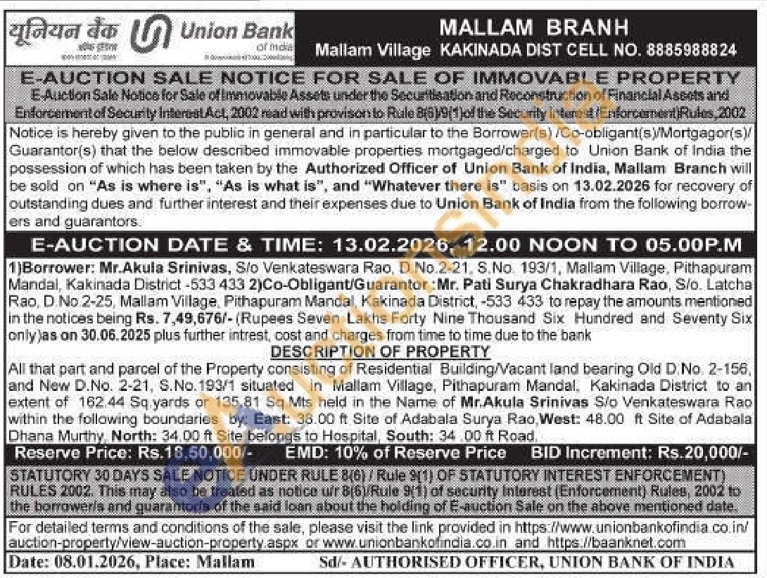 All that part and parcel of the Property consisting of Residential Building/Vacant land bearing Old D. No. 2-156, and New D.No. 2-21, S.No. 193/1 situated in Mallam Village, Pithapuram Mandal, Kakinada District to an extent of 162.44 Sq yards or 135.81 Sq.Mts held in the Name of Mr.Akula Srinivas S/o Venkateswara Rao within the following boundaries by: East: 38.00 ft Site of Adabala Surya Rao, West: 48.00 ft Site of Adabala