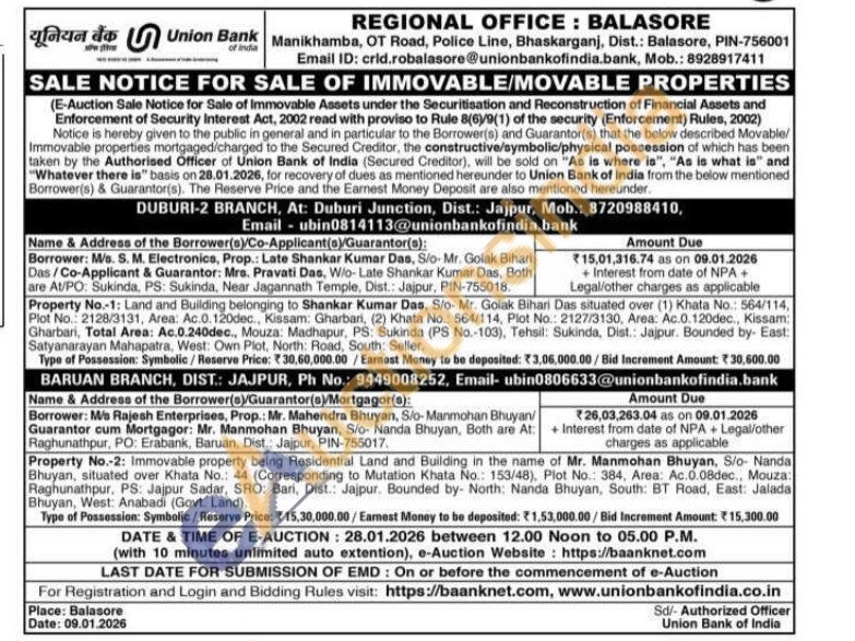 Property No.-1: Land and Building belonging to Shankar Kumar Das, Sio- Mr. Golak Bihari Das situated over (1) Khata No.: 564/114, Plot No.: 2128/3131, Area: Ac.0.120dec, Kissam: Gharbari, (2) Khata No.: 564/114, Plot No.: 2127/3130, Area: Ac.0.120dec., Kissam: Gharbari, Total Area: Ac.0.240dec., Mouza: Madhapur, PS: Sukinda (PS No.-103), Tehsil: Sukinda, Dist.: Jajpur. Bounded by- East: Satyanarayan Mahapatra, West: Own Plot, North: Road, South: Seller.