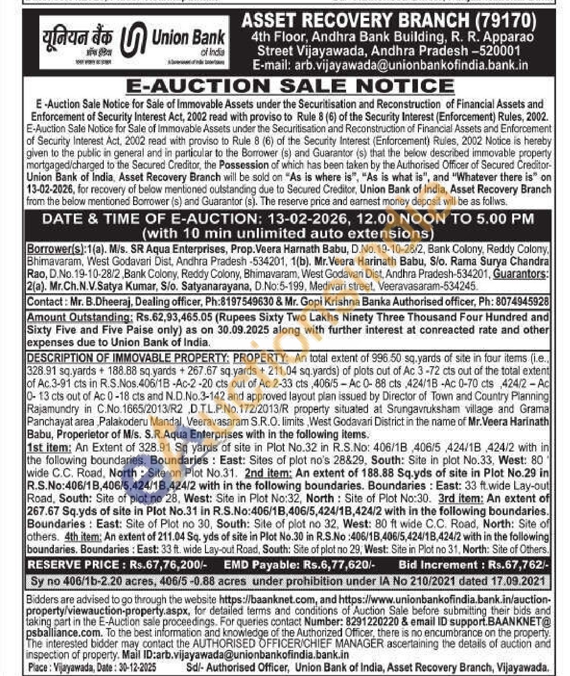 DESCRIPTION OF IMMOVABLE PROPERTY: PROPERTY: An total extent of 996.50 6.50 sq.yards of site in four items (i.e.. 328.91 sq.yards+ 188.88 sq.yards + 267.67 sq.yards + 211.04 sq.yards) of plots out of Ac 3-72 cts out of the total extent of Ac.3-91 cts in R.S.Nos.406/1B-Ac-2-20 cts out of Ac 2-33 cts, 406/5-Ac 0-88 cts,424/18-Ac 0-70 cts 424/2-Ac 0-13 cts out of Ac 0-18 cts and N.D.No.3-142 and approved layout plan issued by Director of Town and Country Planning Rajamundry in C.No.1665/2013/R2 D.T.L.P.No.172/2013/R property situated at Srungavruksham village and Grama Panchayat area Palakoderu Mandal, Veeravasaram S.R.O. limits, West Godavari District in the name of Mr.Veera Harinath Babu, Properietor of M/s. S.R.Aqua Enterprises with in the following items.