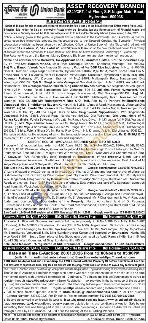Property 1: a) Industrial land extent of 4.00 Acres 30.00 Gts in Sy No 835/A/2, 836/A, 836/B, 837/2, 838/A/2, 839/2 Khanapur village, Grampanchayat and Mandal, Warangal District belonging to Smt. D. Padmaja Wo Shankar, Smt. S. Vijaya Laxmi W/o Venugopal, Smt P.Hymavathi W/ Chandramouli & Smt. V. Satyavathi Wo Rangareddy (late) bounded by Boundaries of the property: North Land of Vendees/Present Assessees, South Land of Vejella Satyavathi one of the assessee, East: Land of M satya Vara prasad and V Satyavathi, West Land of E Kranthi Reddy and M Sunny.