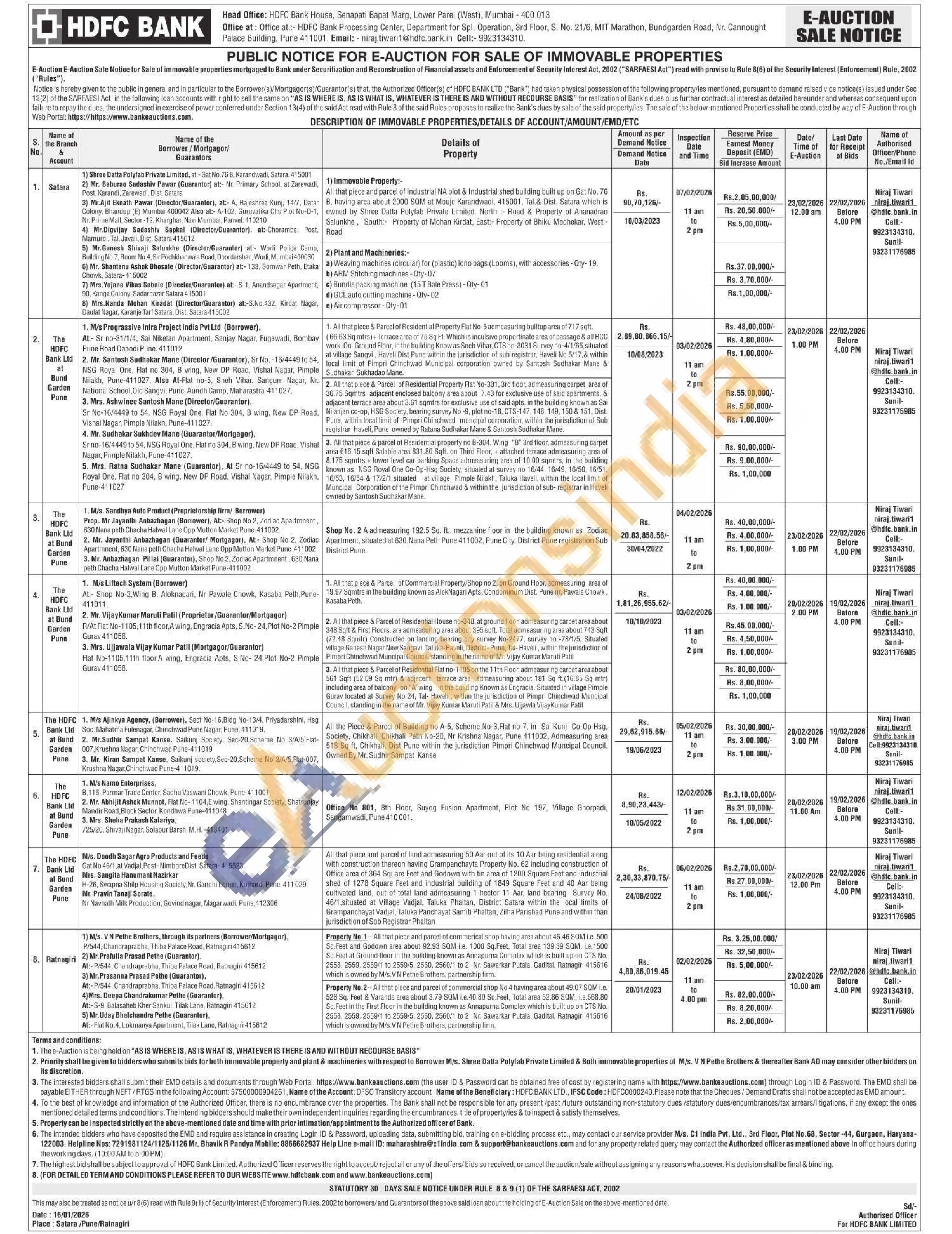 2. All that piece & Parcel of Residential Property Flat No-301, 3rd floor, admeasuring carpet area of 30.75 Sqmtrs adjacent enclosed balcony area about 7.43 for exclusive use of said apartments, & adjacent terrace area about 3.61 sqmtrs for exclusive use of said apts, in the building known as Sai Nilanjan co-op, HSG Society, bearing survey No-9, plot no-18, CTS-147, 148, 149, 150 & 151, Dist. Pune, within local limit of Pimpri Chinchwad muncipal corporation, within the jurisdiction of Sub registrar Haveli, Pune owned by Ratana Sudhakar Mane & Santosh Sudhakar Mane.