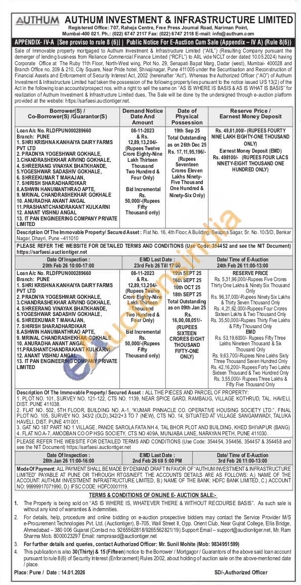 contact Authorized Officer: Mr. Sunil Mohite (Mob: 9834951599