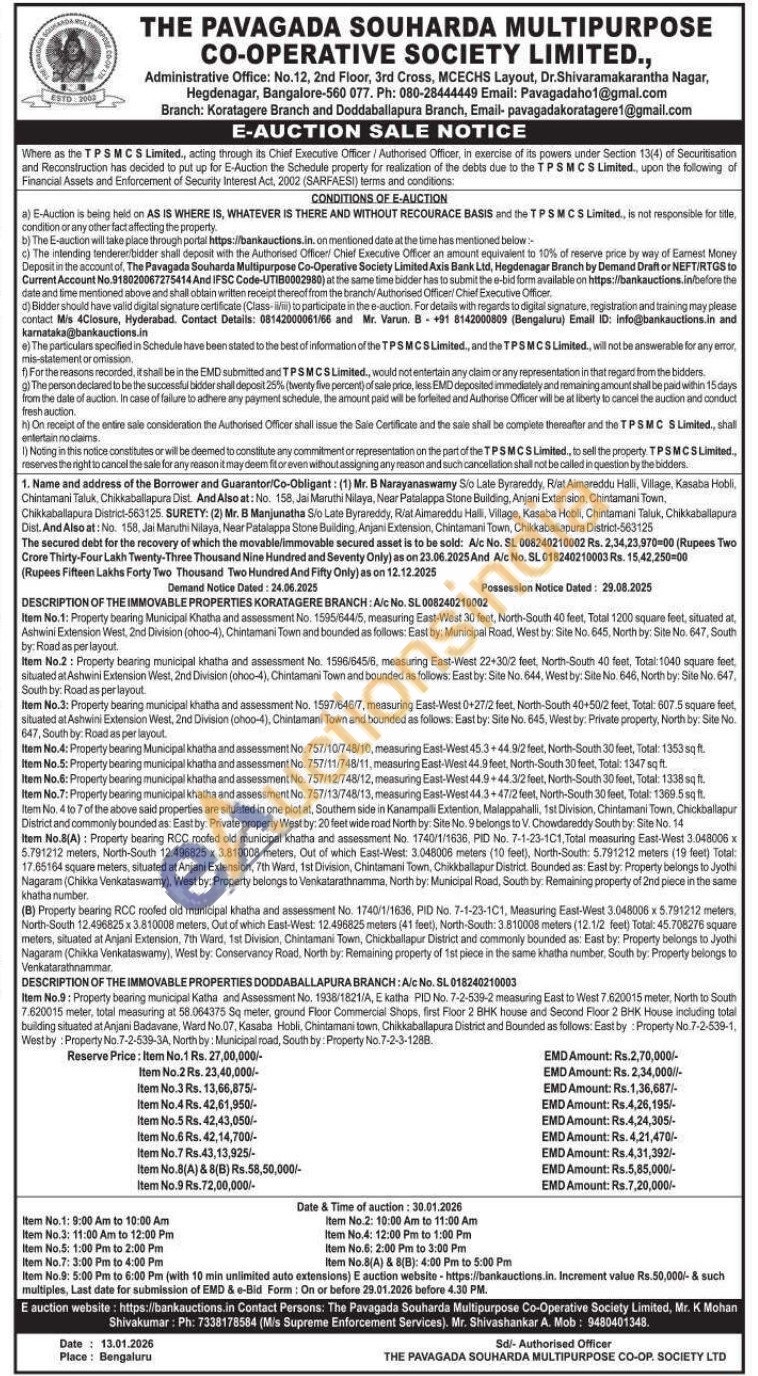 DESCRIPTION OF THE IMMOVABLE PROPERTIES DODDABALLAPURA BRANCH: A/c No. SL 018240210003 Item No.9: Property bearing municipal Katha and Assessment No. 1938/1821/A, E katha PID No. 7-2-539-2 measuring East to West 7.620015 meter, North to South 7.620015 meter, total measuring at 58.064375 Sq meter, ground Floor Commercial Shops, first Floor 2 BHK house and Second Floor 2 BHK House including total building situated at Anjani Badavane, Ward No.07, Kasaba Hobli, Chintamani town, Chikkaballapura District and Bounded as follows: East by: Property No.7-2-539-1, Westby: Property No.7-2-539-3A, North by: Municipal road, South by: Property No.7-2-3-1288
