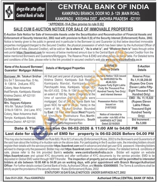All that part and parcel of property located in Krishna District, Kankipadu Sub Registry. Kankipadu Mandal, Kankipadu Gram Panchayathi Area, Kankipadu Village, RS No.43/1,43/2, D No. 9-138/1A. consisting of an extent of 160 Sq. Yards (Originally at the time of sanction 240 Sq. Yards were mortgaged. Out of 240 Sq. Yards Bank has given NOC for sale of 80 Sq. Yards) in the name of Mr. Tatukuri Sridhar. Bounded by:East:18 Feet wide Bazar, West Property of Vinnakota Prabhakara Rao, North: Property of Kuripi Mangatayaru. South Property of Batta Nageswara Rao