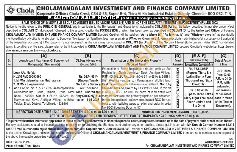 Erode district, Erode Registration district, Anthiyur Sub Registrstion District, Anthiyur Taluk, Anthiyur Vil-lage. RSF NO:968/2A.P.Ac.0.24.5,Old Sf no.651A & 6518 in this West by vendors son Kumarasamy allotted land, East by vendors son Nallasamy allotted land, North by Chinnammal land, South by East West Road, In middie P.Ac, 0.02.8 P.Ac.0.06 1/2 cents of land entire with mamool cart track and pathway rights as per document In this the applicant had new constructed RCC Terrace House, with building approval plan and order in order No.3/2015 bearing Door no.117