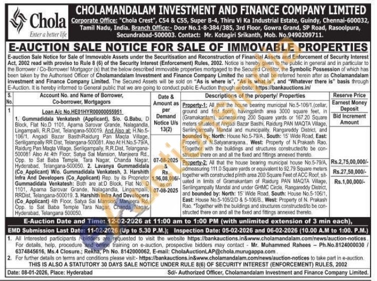 Property-2: All that the house bearing municipal house No.5-79/A, admeasuring 111.0 Square yards or equivalent to 92.79 Square meters together with constructed plinth area 200 Square Feet of ACC Roof, sit-uated in limits of Gramakantam of Raidurg PAN MAQTA Village, Serilingampally Mandall and under GHMC Circle, Rangareddy District, and bounded by: North: 15' Wide Road, South: House No 5-106/1, East: House No.5-105/2/D & 5-106/B., West: Property of N. Prakash Rao. "Together with the buildings and structures constructed to be con-structed there on and all the fixed and fittings annexed thereto