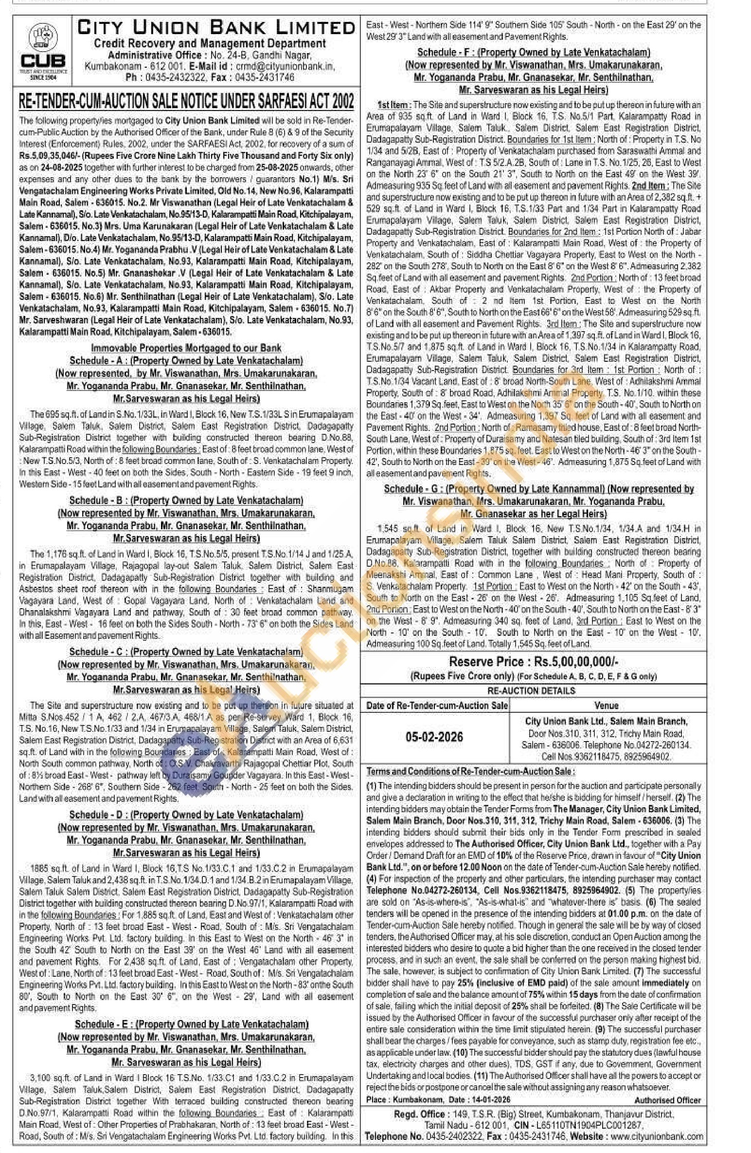 The 695 sq.ft. of Land in S.No. 1/33L, in Ward I, Block 16, New T.S.1/33L Sin Erumapalayam Village, Salem Taluk. Salem District, Salem East Registration District. Dadagapatty Sub-Registration District together with building constructed thereon bearing D.No.88, Kalarampatti Road within the following Boundaries, East of 8 feet broad common Jane, West of New T.S.No.5/3, North of: 8 feet broad common lane, South of S. Venkatachalam Property In this East-West 40 feet on both the Sides, South-North-Eastem Side-19 feet 9 inch, Western Side-15 feet Land with all easement and pavement Rights.
