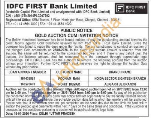 IDFC First Bank Ltd Gold Auctions Auction in New Delhi