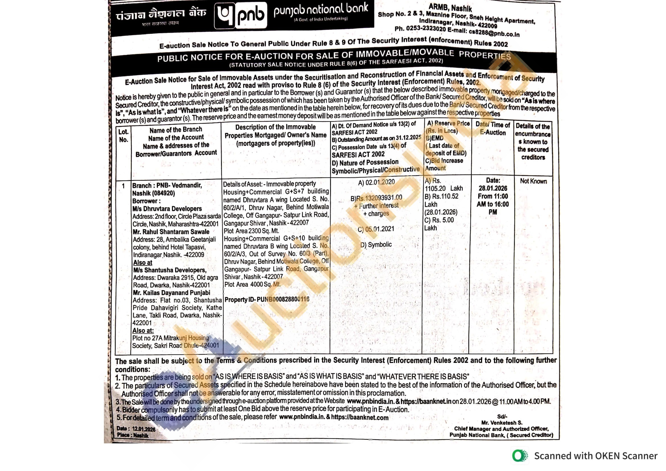 Details of Asset:-Immovable property Housing+Commercial G+S+7 building named Dhruvtara A wing Located S. No. 60/2/A/1, Dhruv Nagar, Behind Motiwala College, Off Gangapur- Satpur Link Road, Gangapur Shivar, Nashik-422007 Plot Area 2300 Sq. Mt. Housing Commercial G+S+10 building named Dhruvtara B wing Located S. No. 60/2/A/3, Out of Survey No. 60/3 (Part). Dhruv Nagar, Behind Motiwala College, Off Gangapur- Satpur Link Road, Gangapur Shivar, Nashik-422007 Plot Area 4000 Sq. Mt.