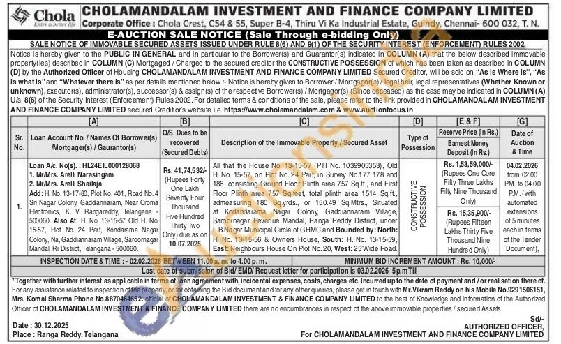 All that the House No. 13-15-57 (PTI No. 1039905353), Old H. No. 15-57, on Plot No. 24 Part, in Survey No.177 178 and 186, consisting Ground Floor Plinth area 757 Sq.ft., and First Floor Plinth area 757 Sq.feet, total plinth area 1514 Sq.ft, admeasuring 180 Sq.yrds., or 150.49 Sq.Mtrs., Situated at Kodandarama Nagar Colony, Gaddiannaram Village, Saroornagar Revenue Mandal, Ranga Reddy District, under L.B.Nagar Municipal Circle of GHMC and Bounded by: North: H. No. 13-15-56 & Owners House, South: H. No. 13-15-59, East: Neighbours House On Plot No. 20, West: 25 Wide Road.