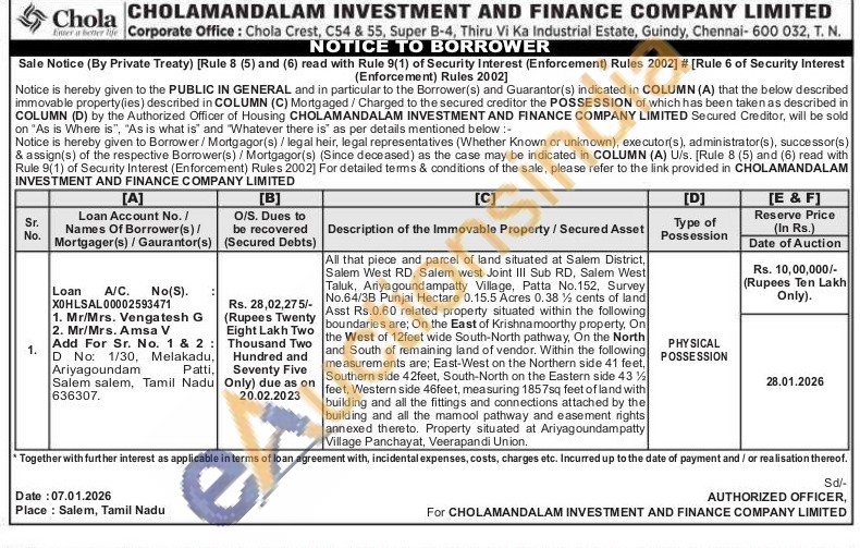 All that piece and parcel of land situated at Salem District, Salem West RD, Salem west Joint III Sub RD, Salem West Taluk, Ariyagoundampatty Village, Patta No.152, Survey No.64/3B Punjai Hectare 0.15.5 Acres 0.38% cents of land Asst Rs.0.60 related property situated within the following boundaries are; On the East of Krishnamoorthy property, On the West of 12feet wide South-North pathway, On the North and South of remaining land of vendor. Within the following measurements are; East-West on the Northern side 41 feet, Southern side 42feet, South-North on the Eastern side 43% feet, Western side 46feet, measuring 1857sq feet of land with building and all the fittings and connections attached by the building and all the mamool pathway and easement rights annexed thereto. Property situated at Ariyagoundampatty Village Panchayat, Veerapandi Union.