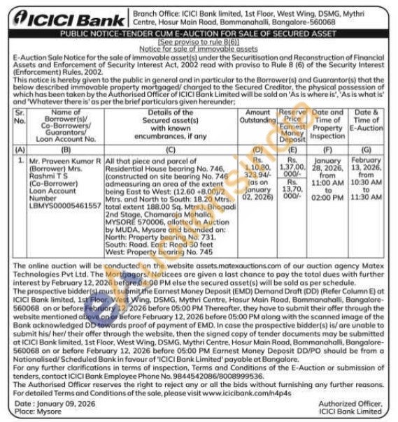 All that piece and parcel of Residential House bearing No. 746, (constructed on site bearing No. 746 admeasuring an area of the extent being East to West: (12.60 +8.001/2 Mtrs, and North to South: 18.20 Mtrs. total extent 188.00 Sq. Mtrs.), Bhogadi 2nd Stage, Chamaraja Mohalla, MYSORE 570006, allotted in Auction by MUDA, Mysore and bounded on: North: Property bearing No. 731. South: Rood. East: Road 30 feet West: Property bearing No. 745