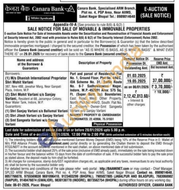 Part and parcel of Residential Flat No. 1, Ground Floor, Plot No. 444/C, IDA Scheme No. 31. Traffic Route No. 6-7 Sadhuwaswani Nagar, Indore, M.P.-452001 Area: 575 Sq. Ft. (Super Built Up) Boundaries: East: Road, West: Other Property, North: Plot No. 444/0, South: Flat No. 2. Property Owner-Smit Sangeeta Varlani w/o Sanjay VartaniBAANKNET PROPERTY ID: CARBOHANISH COORDINATES: 22.42056, 75.51551